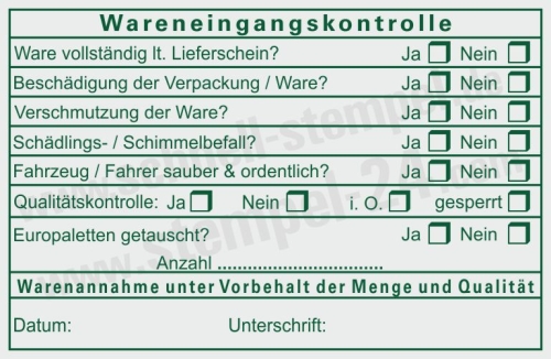 Textplatte: Wareneingangskontrolle, Ware vollständig lt. Lieferschein Ja / Nein, Beschädigung der Verpackung Ja / Nein, Verschmutzung der Ware Ja / Nein, Schädlings- / Schimmelbefall Ja / Nein, Fahrzeug / Fahrer sauber und ordentlich Ja / Nein, Qualitätskontrolle Ja / Nein, i.O., gesperrt, Europaletten getauscht Ja / Nein, Anzahl ......, Datum ...., Unterschrift ..... .